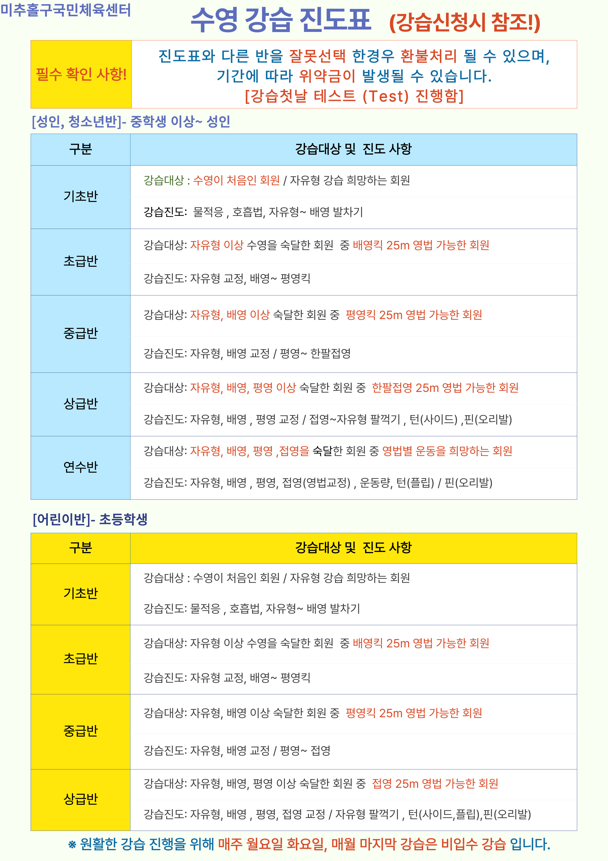 수영강습진도표 작성자 국민체육센터 등록일자 2025년 4월 3일 11시 19분 49초 조회 4,821 문화체육팀_-강습진도표-001.jpg [ Size : 1.1MB , Down : 1,041 ] 미리보기 다운로드 목록보기