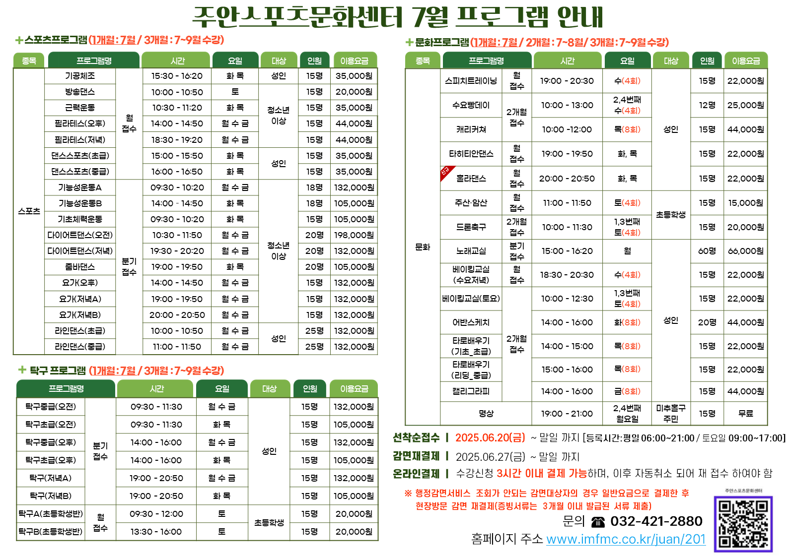 주안스포츠문화센터 7월 프로그램 안내 작성자 주안스포츠문화센터 등록일자 2025년 6월 20일 12시 26분 17초 조회 354 슬라이드2.PNG [ Size : 162.62KB , Down : 405 ] 미리보기 다운로드 슬라이드1.PNG [ Size : 203.98KB , Down : 432 ] 미리보기 다운로드 목록보기