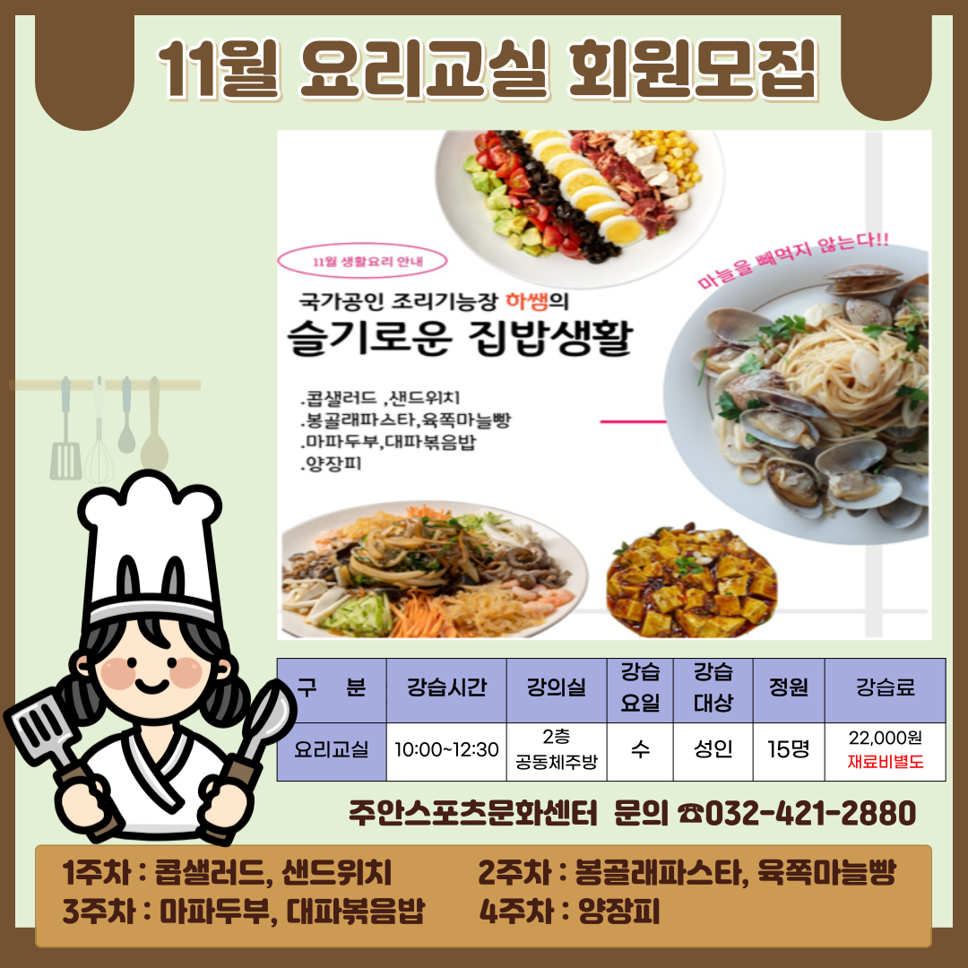 11월 요리교실 회원모집 작성자 주안스포츠문화센터 등록일자 2024년 10월 15일 16시 53분 33초 조회 279 11월 요리교실 안내문.png [ Size : 654.95KB , Down : 267 ] 미리보기 다운로드 목록보기