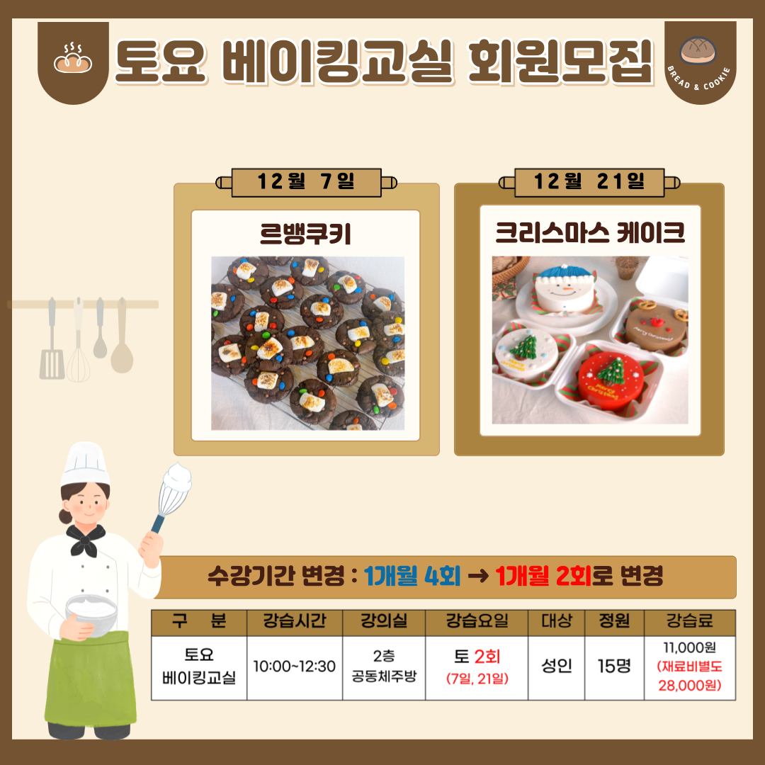 12월 토요 베이킹교실 회원모집 작성자 주안스포츠문화센터 등록일자 2024년 11월 18일 15시 57분 4초 조회 253 12월 토요베이킹교실 모집.png [ Size : 464.58KB , Down : 234 ] 미리보기 다운로드 목록보기
