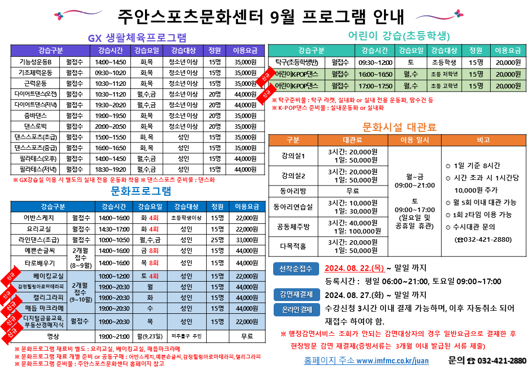 주안스포츠문화센터 9월 프로그램 접수 안내 작성자 주안스포츠문화센터 등록일자 2024년 8월 19일 9시 29분 24초 조회 257 슬라이드1.PNG [ Size : 114.34KB , Down : 180 ] 미리보기 다운로드 슬라이드2.PNG [ Size : 49.6KB , Down : 149 ] 미리보기 다운로드 목록보기