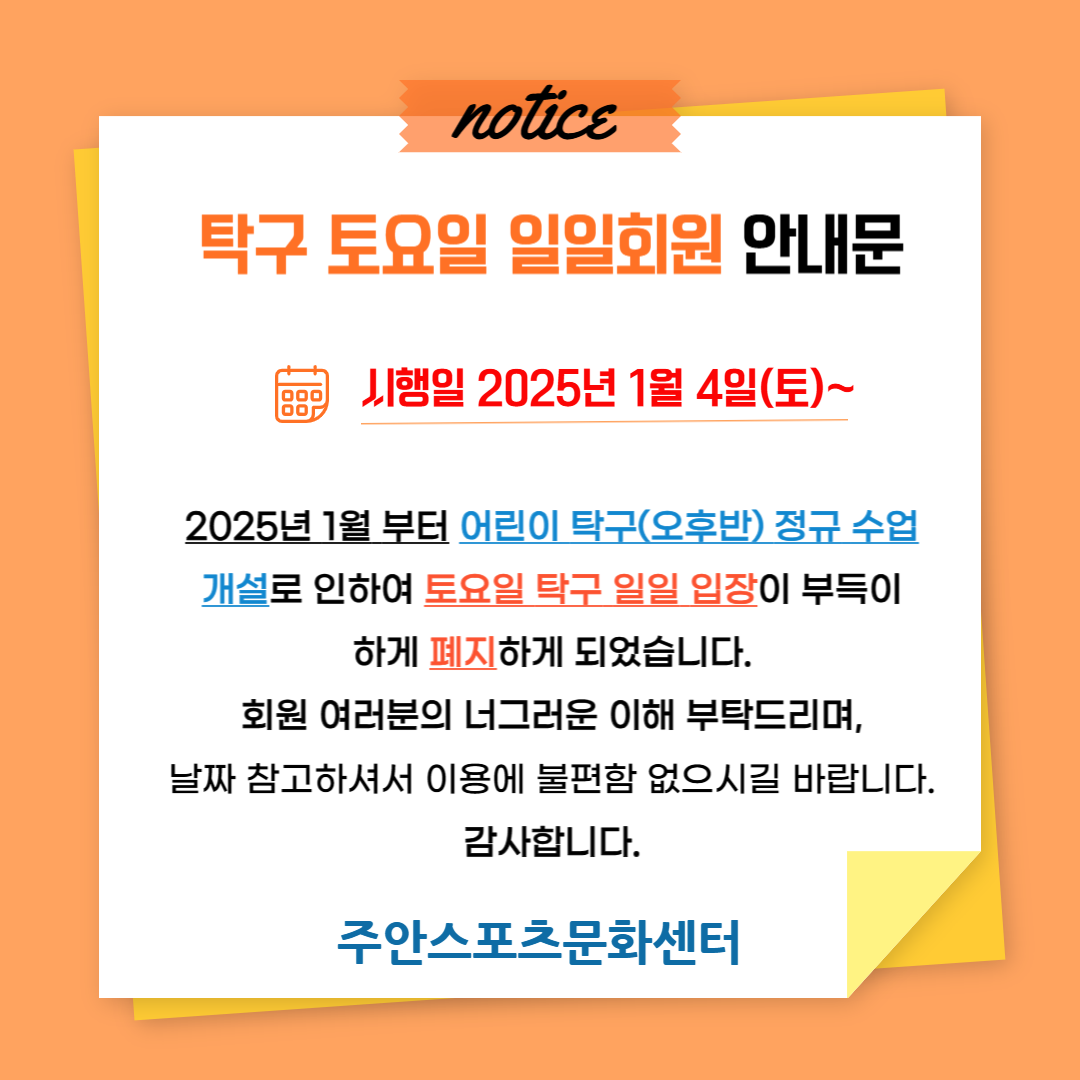 탁구 토요일 일일회원 안내문 작성자 주안스포츠문화센터 등록일자 2024년 10월 14일 13시 10분 54초 조회 311 탁구 토요일 일일회원 안내문.png [ Size : 191.3KB , Down : 269 ] 미리보기 다운로드 목록보기