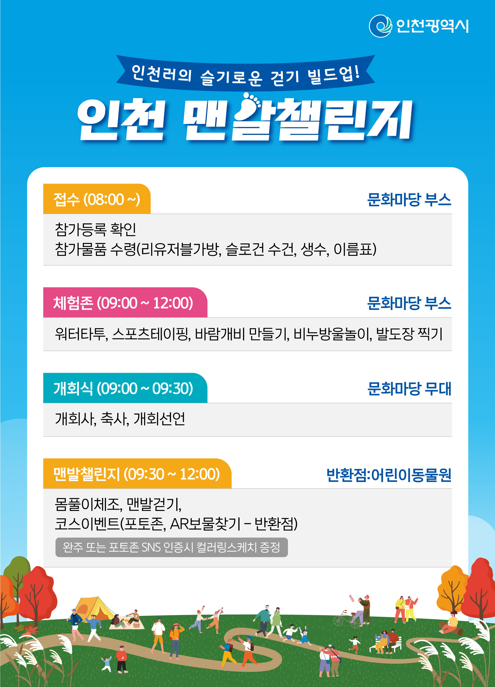 인천 맨발챌린지 개최 안내 작성자 주안스포츠문화센터 등록일자 2024년 10월 7일 16시 20분 56초 조회 223 2014년 아시안게임. 패러게임 10주년 기념의 해를 맞이하여 인천 맨발챌린지 가 개최되오니 많은 참여 부탁드립니다. 행사안내(1920x2661).jpg [ Size : 524.45KB , Down : 155 ] 미리보기 다운로드 홍보배너(1000x1000).jpg [ Size : 186.52KB , Down : 164 ] 미리보기 다운로드 코스안내(1920x3566).jpg [ Size : 735.77KB , Down : 184 ] 미리보기 다운로드 목록보기