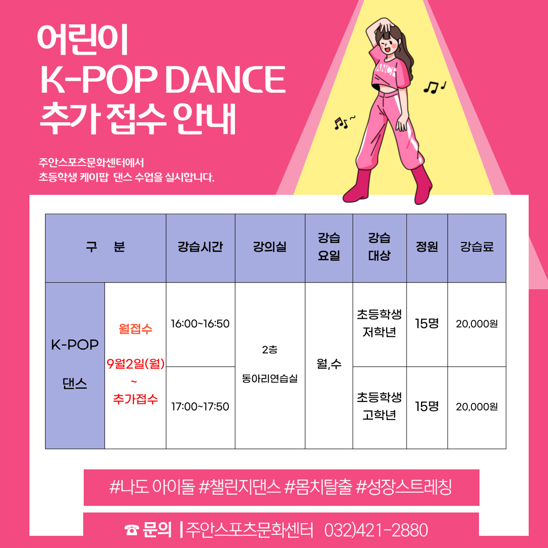 어린이 K-POP댄스 9월 추가 접수 안내 작성자 주안스포츠문화센터 등록일자 2024년 8월 30일 17시 1분 18초 조회 222 9월2일 케이팝 추가모집.png [ Size : 178.16KB , Down : 136 ] 미리보기 다운로드 목록보기