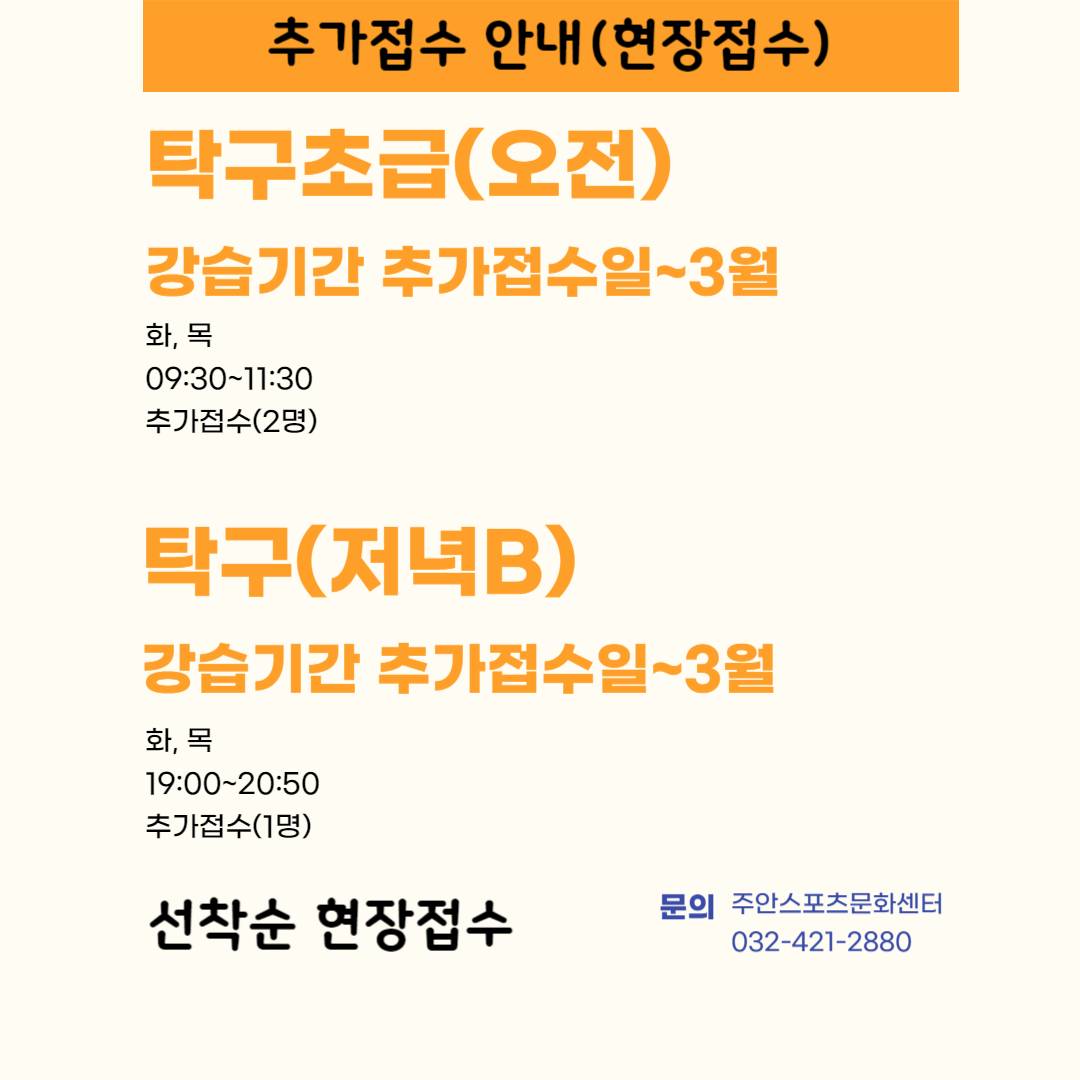 주안스포츠문화센터 프로그램 추가접수 안내 작성자 주안스포츠문화센터 등록일자 2024년 2월 15일 17시 14분 18초 조회 283 제목을 입력해주세요_-001.png [ Size : 137.68KB , Down : 215 ] 미리보기 다운로드 목록보기
