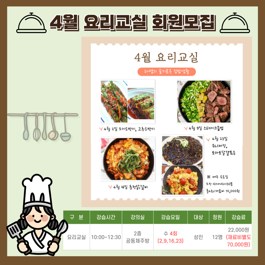 4월 요리교실 회원모집 작성자 주안스포츠문화센터 등록일자 2025년 3월 18일 13시 21분 14초 조회 218 4월 요리교실.png [ Size : 546.08KB , Down : 160 ] 미리보기 다운로드 목록보기